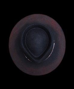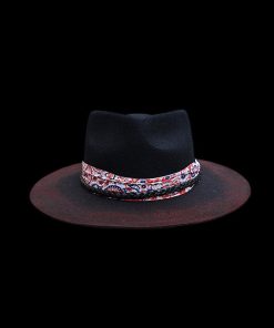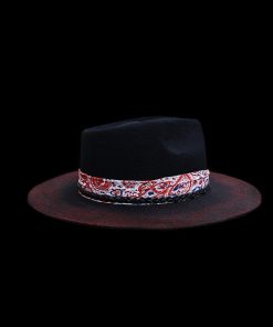 “Distressed Fedora with Red and White Patterned Band” is hand-distressed, hand-dyed, and hand-torched, ensuring no two share the same color or design. Each piece is uniquely imperfect, with subtle variations from product images.