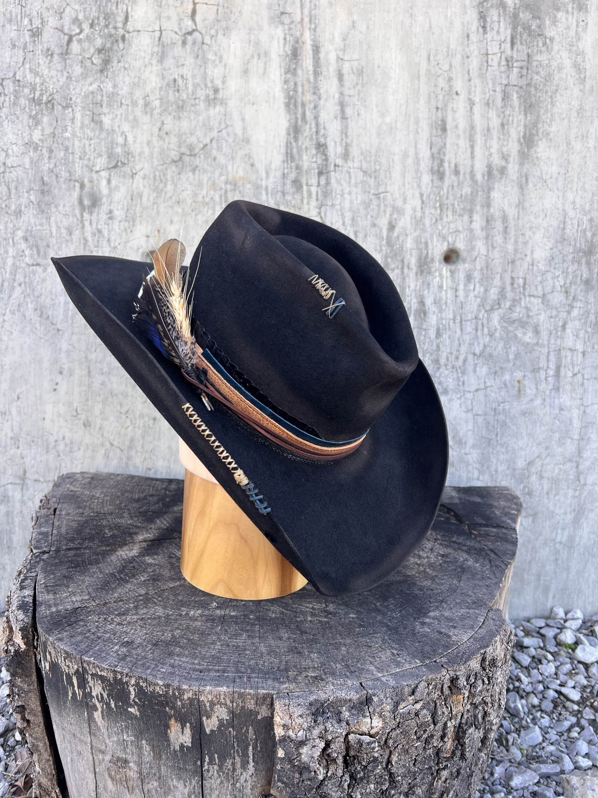 “Ebony Blue Vintage Felt Cowboy Hat” is hand-distressed, hand-dyed, and hand-torched, ensuring no two share the same color or design. Each piece is uniquely imperfect, with subtle variations from product images.