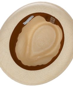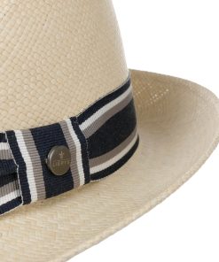 Panama straw is the summery material of choice for this trilby and has been carefully woven using traditional handcrafting methods. The straw hat with a characteristically shaped crown and brim feels airy and lightweight atop the head and flatters the wearer with its plain-coloured design. This is complemented by a stylish, colourfully striped grosgrain ribbon trim with brand pin, which adds the visual finishing touch.