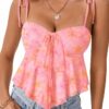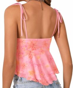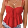 - Features: V Neck, Tie Front, Sleeveless, tie spaghetti strap, Ruffle hem, Peplum cami top. Tie Front design show the lines of the shoulders and neck to the greatest extent, revealing the graceful curves unique to woman.