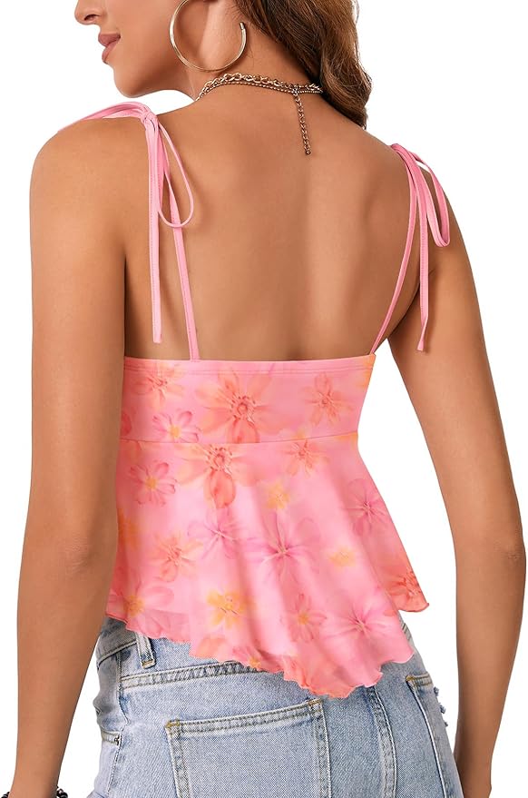 - Features: V Neck, Tie Front, Sleeveless, tie spaghetti strap, Ruffle hem, Peplum cami top. Tie Front design show the lines of the shoulders and neck to the greatest extent, revealing the graceful curves unique to woman.