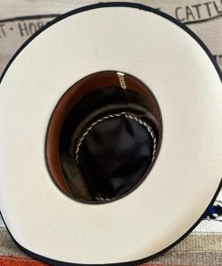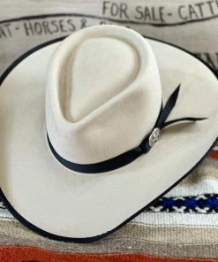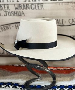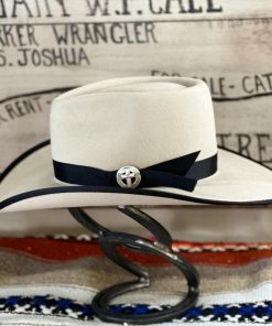 This light belly and it’s tan tones fit the bill with the black trim. The pinched front crown is 4.5 in the back with a slight slope to 4 in the front. The 4 brim has a soft roll on the sides with a black bound edge. The 7/8 grosgrain ribbon has an old fashioned look with a Cross concho to anchor it. Overall this hat is very unique with it’s look, band and style.