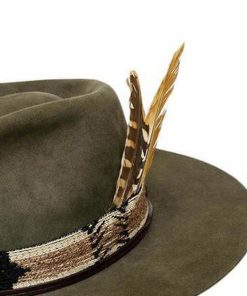 The “Rustic Rebel” fedora in a striking green color with a short brim, featuring 2 feathers and a unique band loop. This hat exudes a rugged yet rebellious charm, perfect for those who dare to defy convention and embrace their individuality.