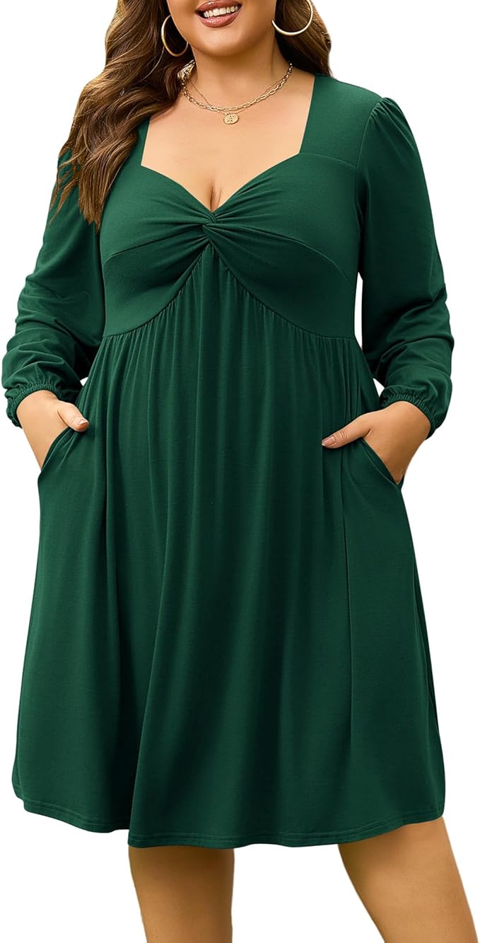 - Feature: The feminine sweetheart neckline is the standout feature of this tea party dress, beautifully highlighting your clavicle. square with deep v-neck,twist knot front,long puff lantern sleeve, pockets on both sides of the dress can hold your keys etc,The pleated waist at the front hides the belly,Slimming the figure, showing femininity