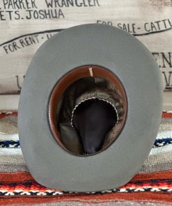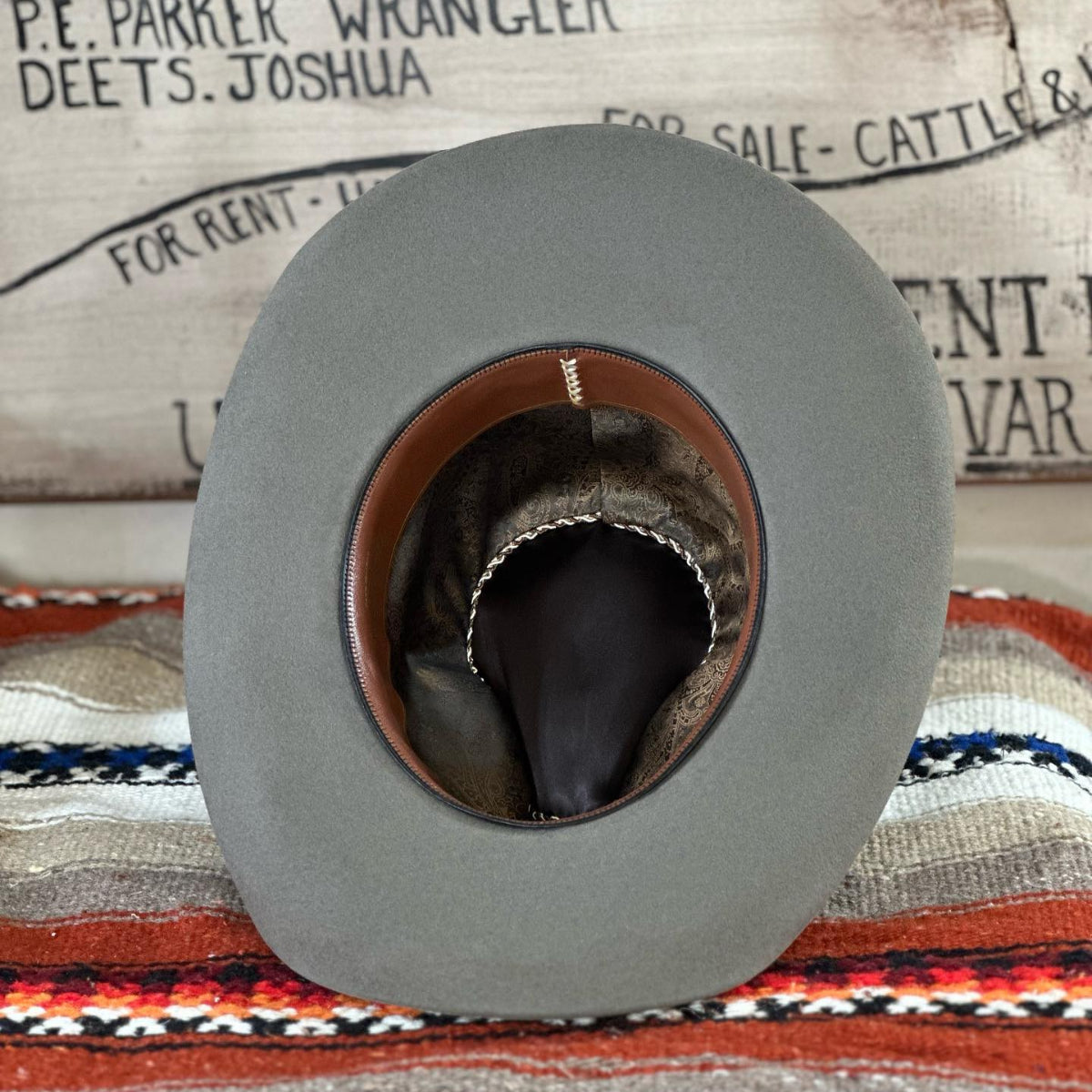 It has a low profile Gus creased crown that is 4.75 in the back and slopes to 4.25 in the front. The 3.75 brim has a small pencil curl on the sides and a nice slope in the front and back. It is topped off with an antique looking leather hat band. We really like this one with its unique look and versatility.