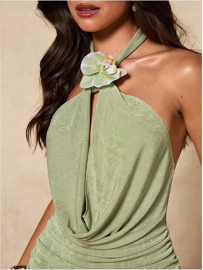 - Features: Draped front, ruched, sleeveless, open back, 3d flower, tie halter neck, mini pencil dresses for women
